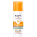?Eucerin solar Oil Control Color SPF 50+ es un protector solar facial con color para pieles grasas y con tendencia al acné. La Tecnología Espectral Avanzada combina filtros UVA y UVB de banda ancha y fotoestables para una protección UV muy alta con la Licochalcona A para neutralizar los radicales libres causados por los rayos UV y la luz HEVIS, y el Ácido Glicirretínico que favorece el mecanismo de reparación del ADN propio de la piel. Los pigmentos de color ayudan a lograr un tono de piel más uniforme y homogéneo, pudiendo elegir entre un tono claro o medio. La tecnología Oil Control, con L-Carnitina y pigmentos que absorben los lípidos proporciona a la piel una apariencia seca al tacto de inmediato y un efecto antibrillo duradero por hasta 12 horas.