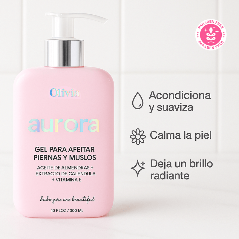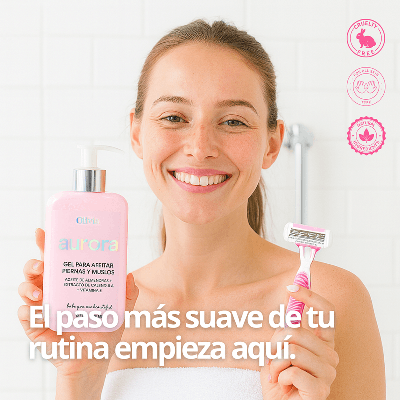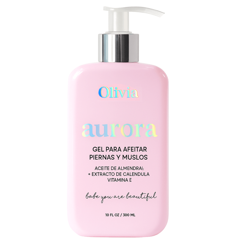 Descubre una nueva forma de afeitarte con Olivia Beauty, linea Aurora Gel para Afeitar Piernas y Muslos, una fórmula suave y altamente hidratante que deja tu piel lisa, protegida y radiante después de cada uso.