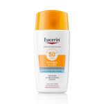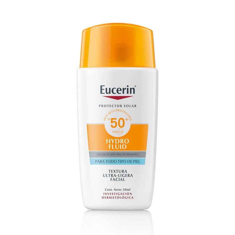 Eucerin Hydro Fluid SPF 50+ protector solar facial de textura ultraligera tipo gel, se absorbe en segundos sin dejar brillo ni residuos.